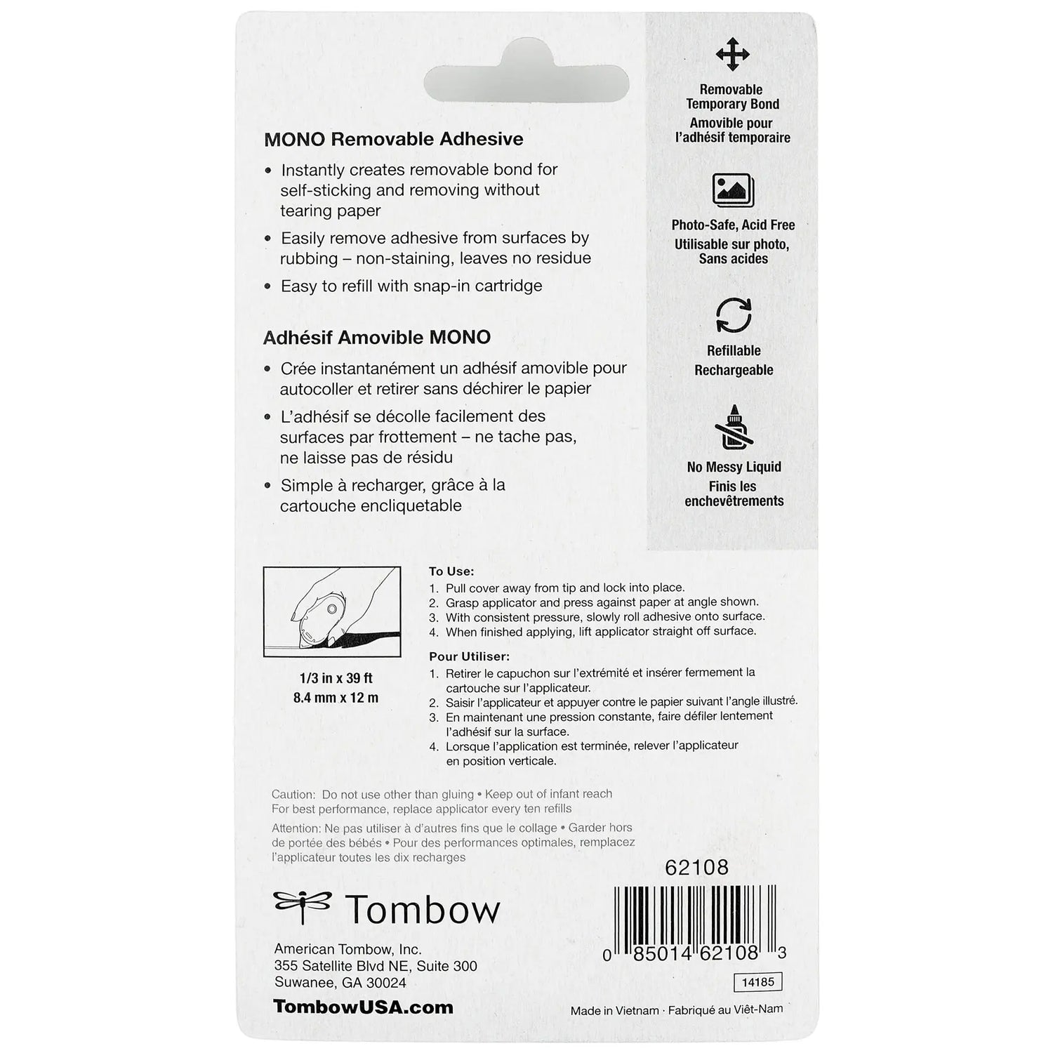 Instantly creates a removable bond for self-sticking and removing. For use on paper, photos, cardstock, planners, etc. Easy to refill with snap-in refill cartridge. Approved Photographic Activity Test (PAT). 1/3 in. x 472 in. Removable bond.