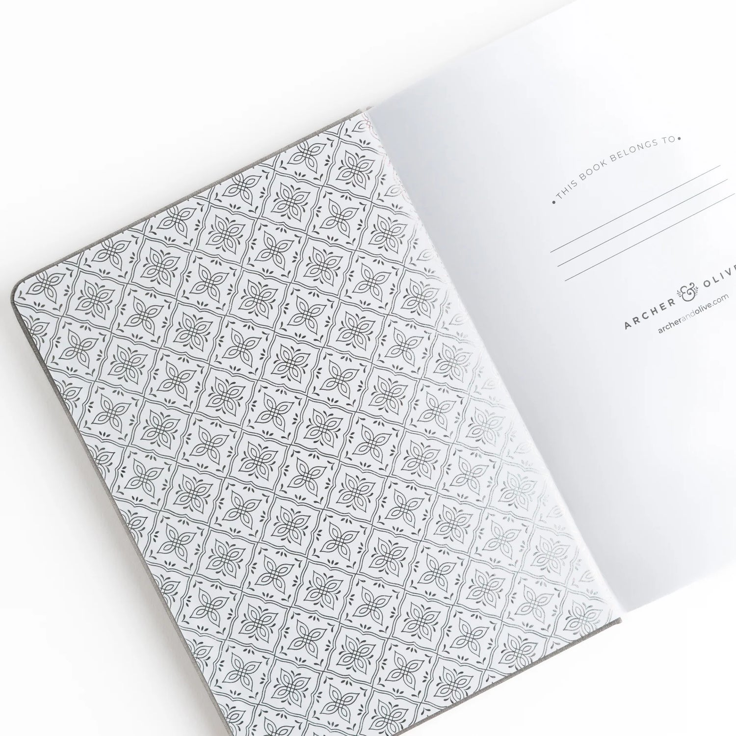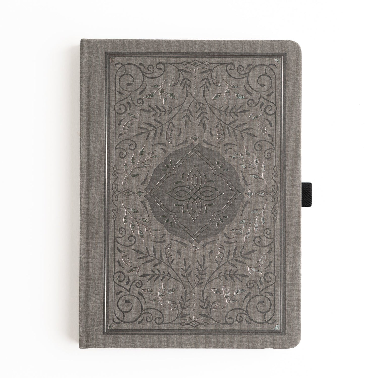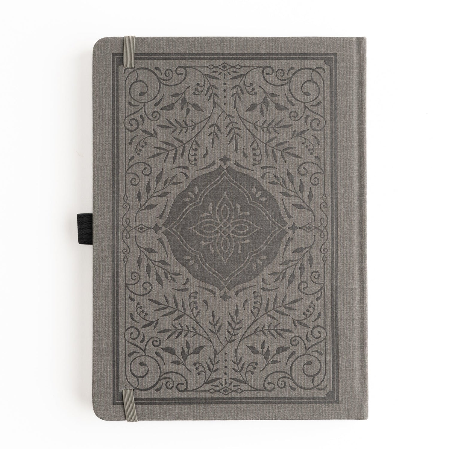 Plan out your days, weeks, and months all year long with our Storybook Undated Planner. This planner features an intricate full cover design inspired by vintage special edition books, part debossed and part hand stamped with an iridescent foil with a pewter and copper shift on a gray vegan leather cover. This design spans the full notebook, with special debossed and foiled details on the back cover, spine and front cover.