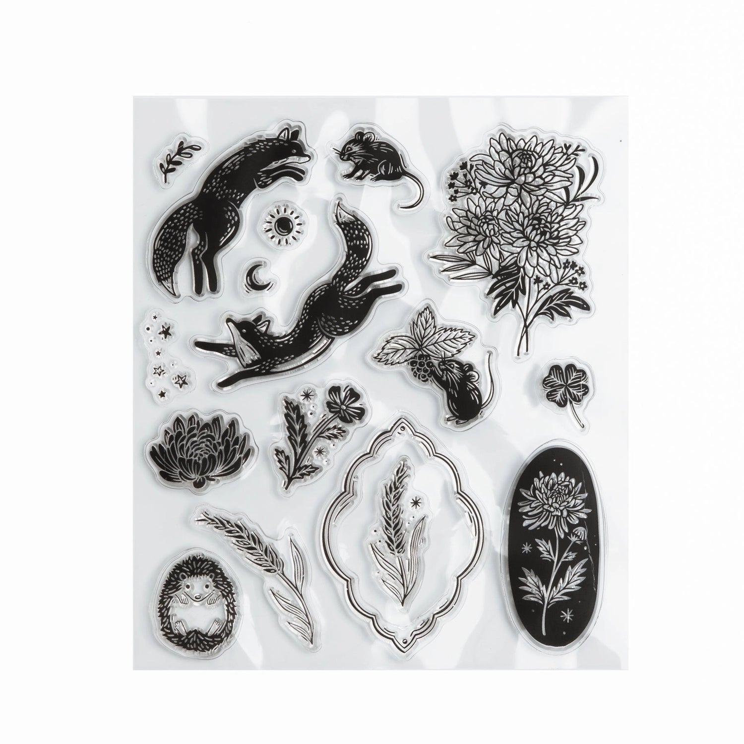 A 16-piece clear stamp set featuring woodland-themed illustrations including foxes, florals, field mice, frames, and botanicals. Ideal for journaling, cardmaking, and seasonal layouts.