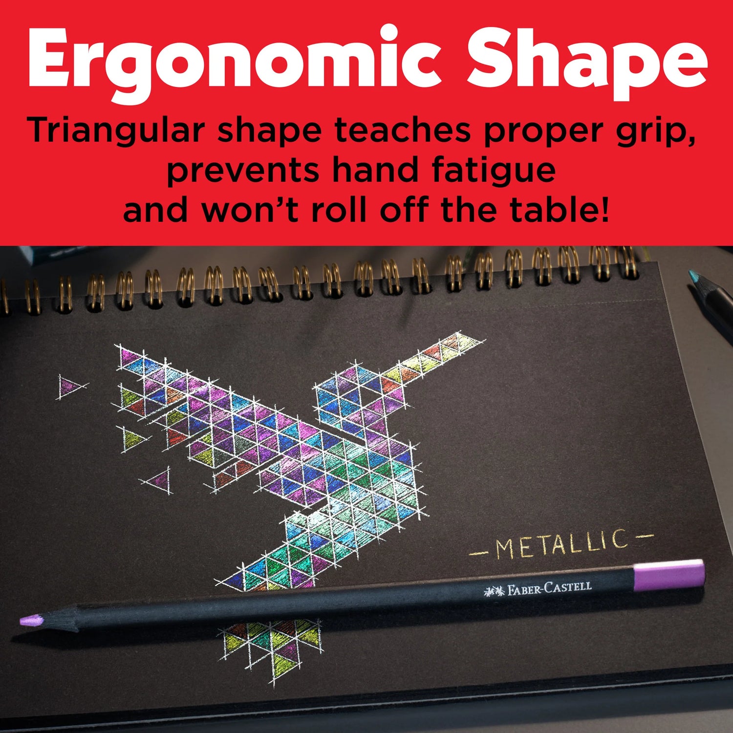 The ergonomic triangular shape of the pencils automatically ensures the correct grip position for optimum comfort while drawing and prevents hand fatigue when creating art. Pencils will not roll off of or away from the work surface as well.