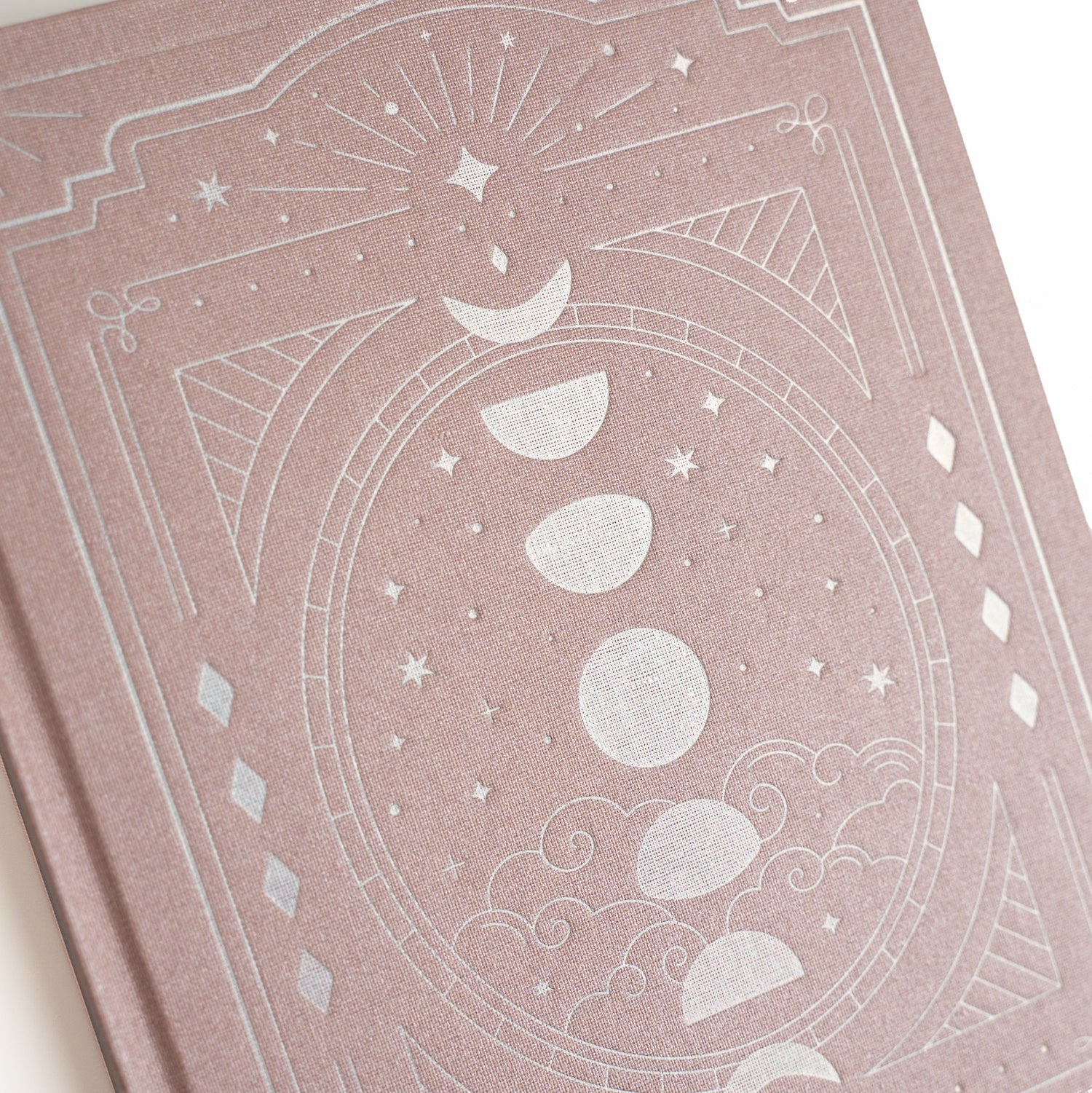 Introducing the B5 Wonderstruck in Shimmer Notebook, featuring a captivating full cover design inspired by moon phases and the night sky, hand stamped in holographic foil on a dreamy cool pink shimmery buckram cover.