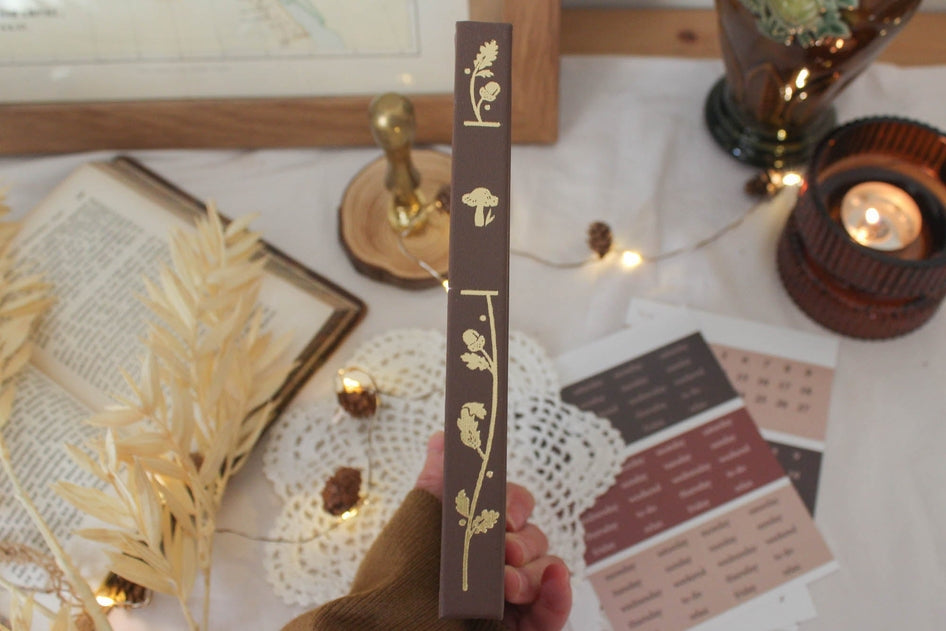 Introducing our newest dot grid notebook - Mushroom & Acorns B6 dot grid journal with 160 pages of 120 gsm paper. Our Mushroom & Acorns Journal features beautiful hand drawn mushrooms in an ornate oval frame decorated with acorns.