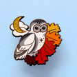 This fabulous Autumn Owl pin is the perfect way to show off your love of the Fall season! This pin features a snowy owl with screen printed detail, surrounded by fall leaves and a glittery moon. It’s an eye-catching pin, perfect for brightening up any coat, bag or hat!