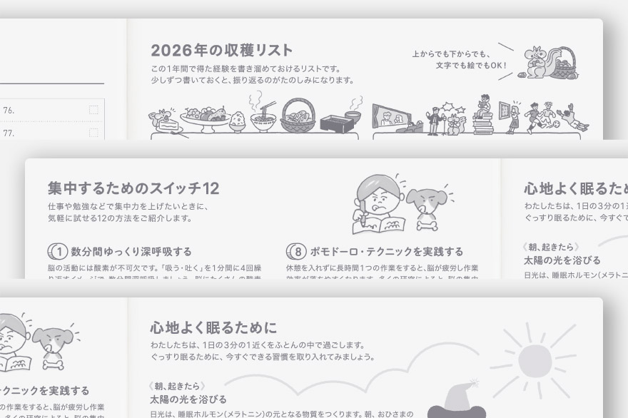 Other than the daily pages with lots of space to write, the book contains several sections that are great for schedule management, such as a yearly calendar, monthly calendar, and yearly index page. The back of the book has bonus pages, including Memories 2026, 12 Switches to Help You Focus, and For a Comfortable Night’s Sleep.