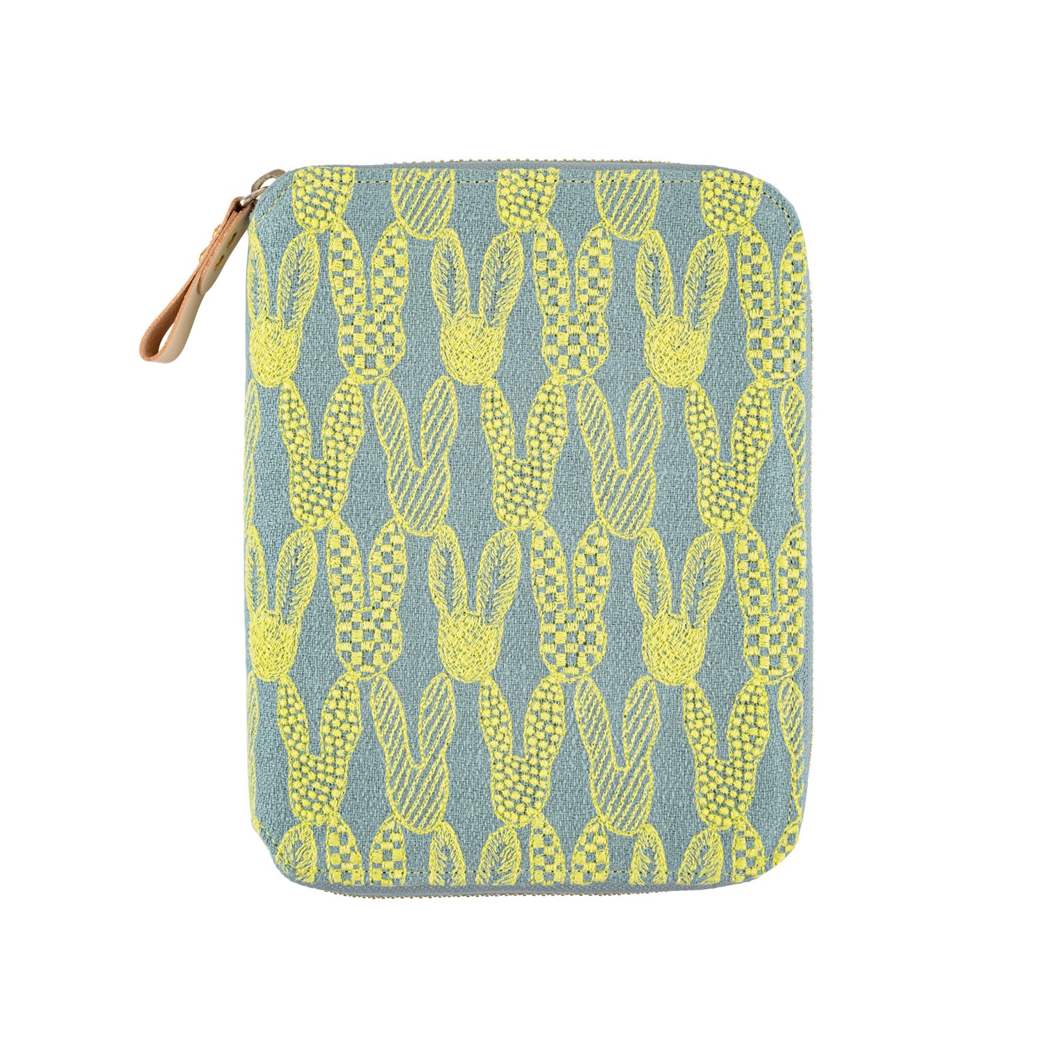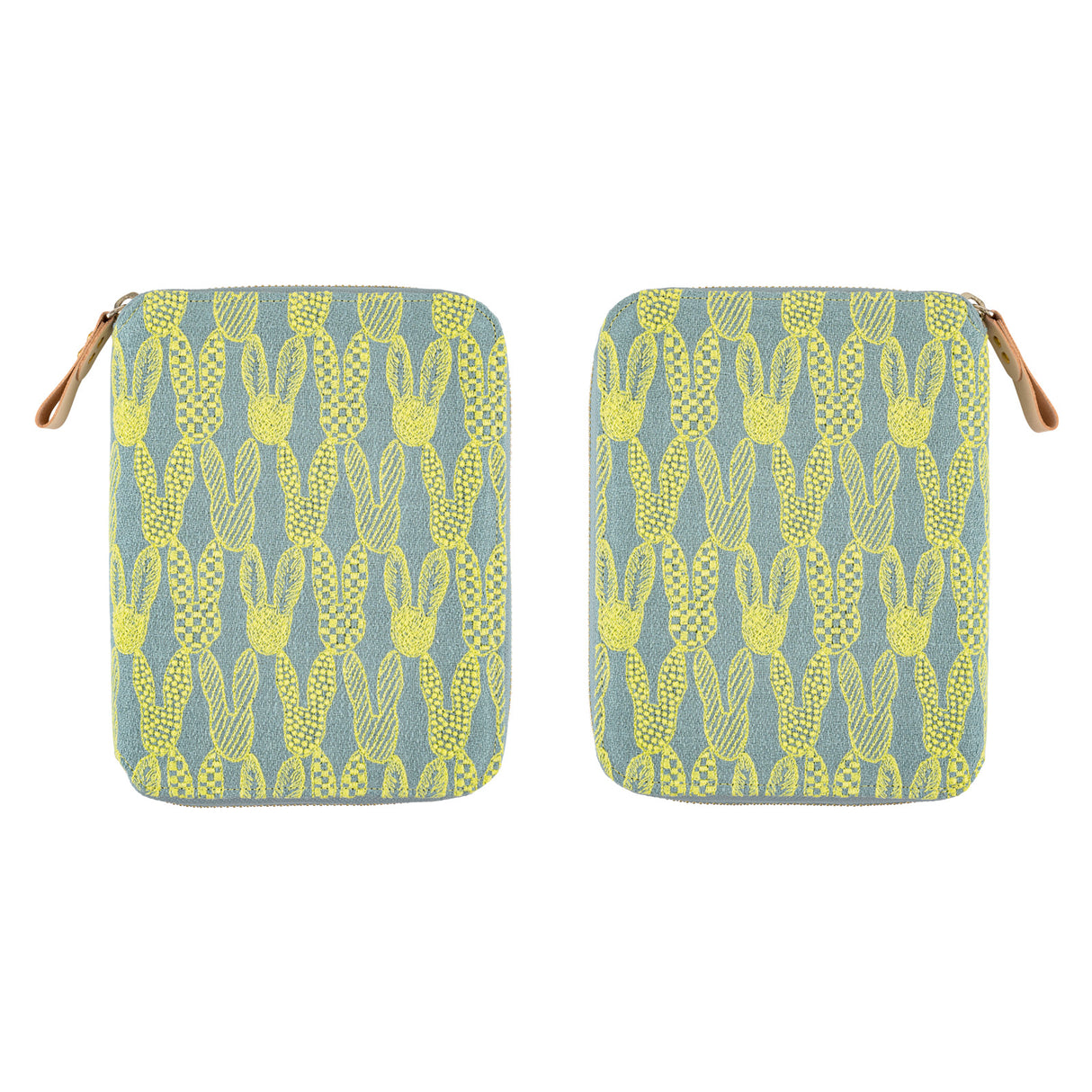 We chose the same bright yellow for the interior as for the embroidery thread. The cover includes two bookmarks, one light blue and the other pink.