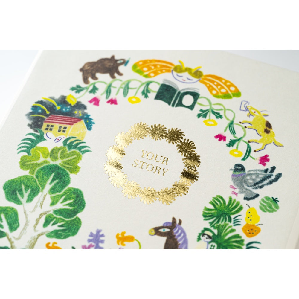 We also put a lot of thought into the box. The lid of the box depicts animals playing with lively plants. The center has the words “Your Story” foil-pressed in gold.