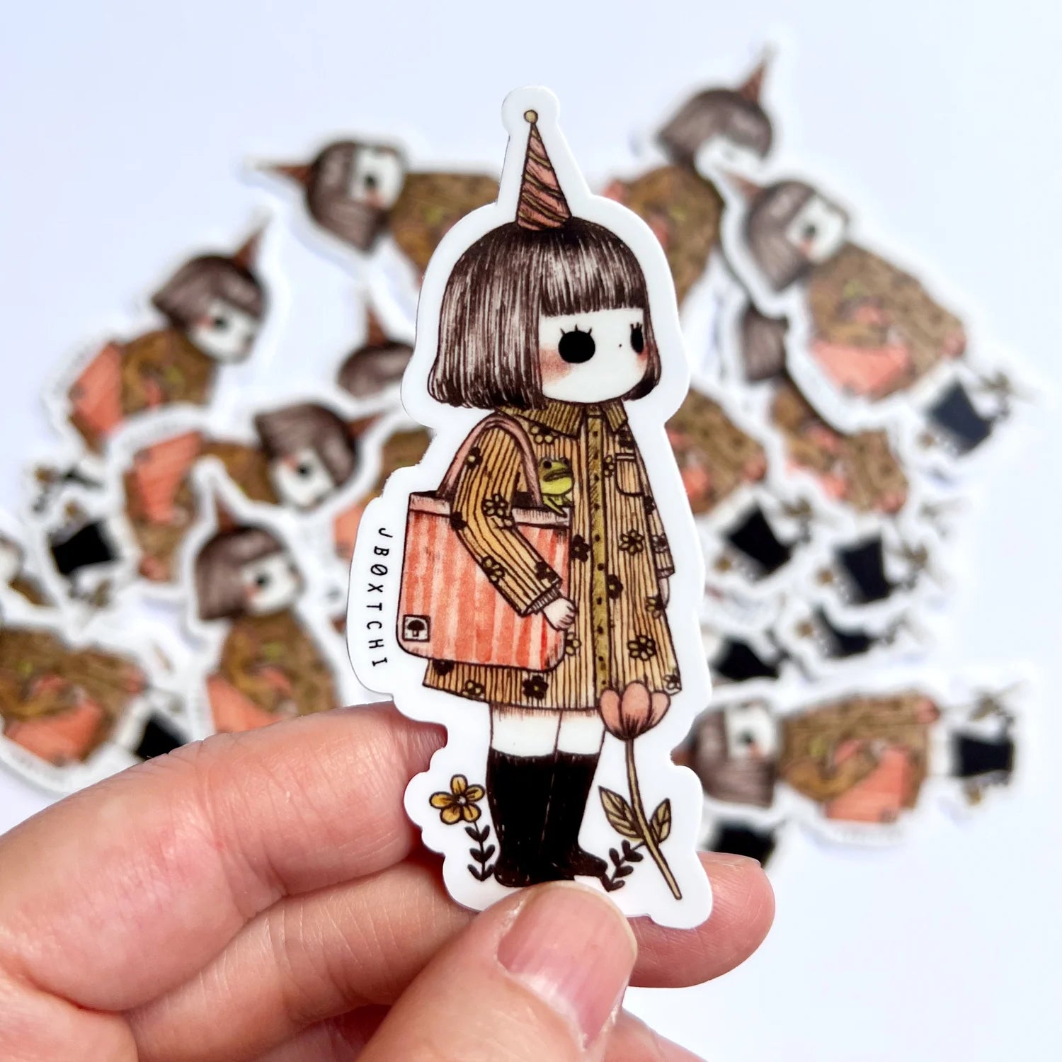 The little girl vinyl sticker was illustrated by jb0xtchi (Jessica Ng). jb0xtchi creates stationary and small trinkets from whimsical ideas in the form of painting using ink, watercolour, and gouache.