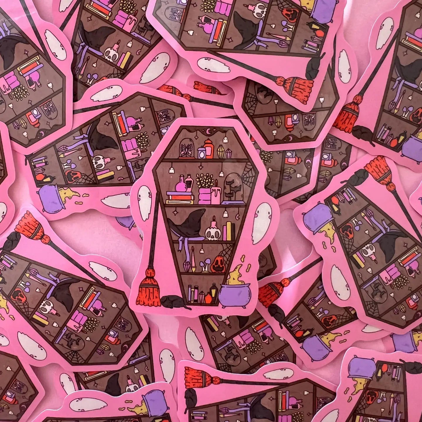 Cute little bookshelf shaped like a coffin. The sticker is made of high-quality vinyl and is weatherproof, so it can be used on any surface.
