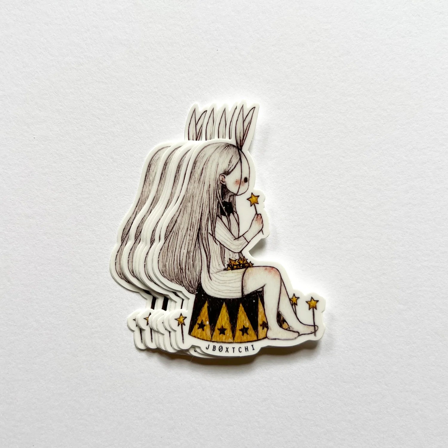 The starry girl vinyl sticker was illustrated by jb0xtchi (Jessica Ng). jb0xtchi creates stationary and small trinkets from whimsical ideas in the form of painting using ink, watercolour, and gouache.