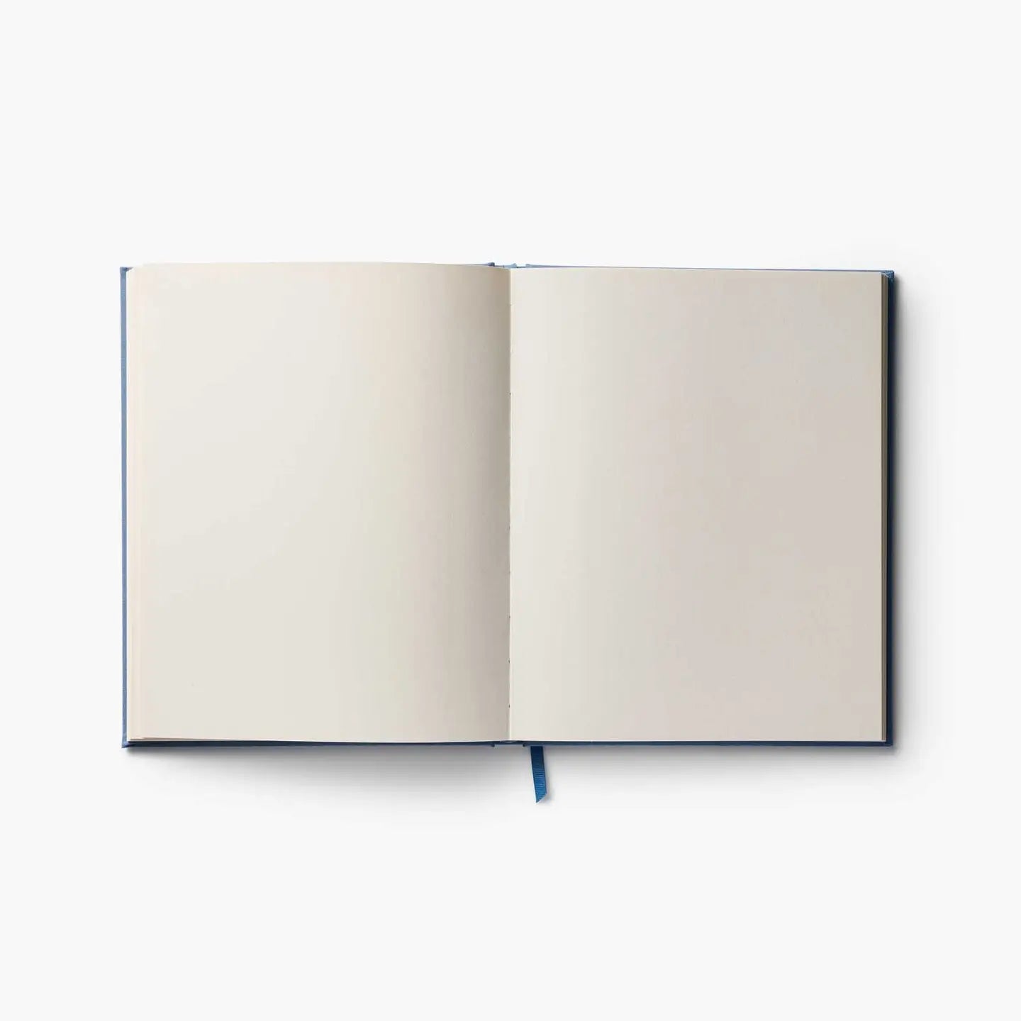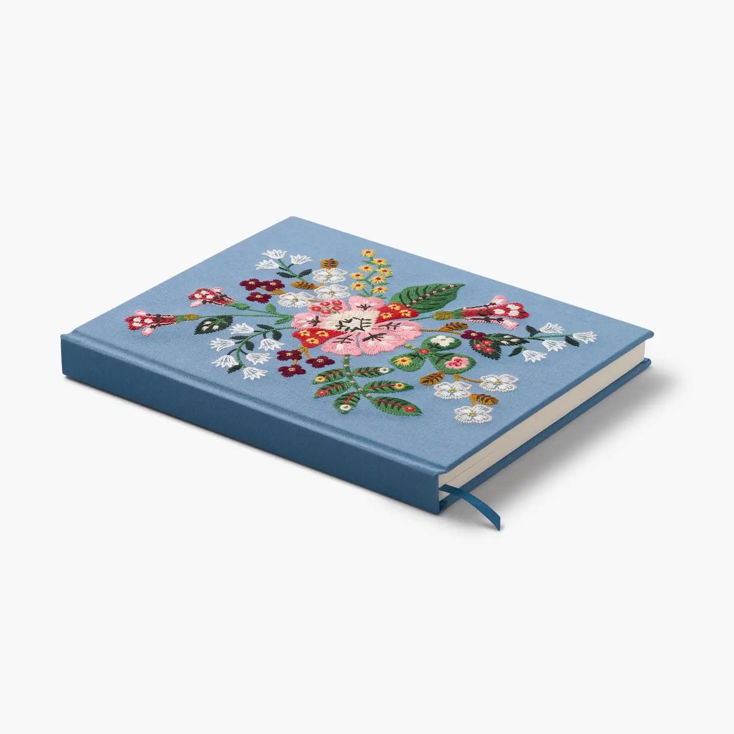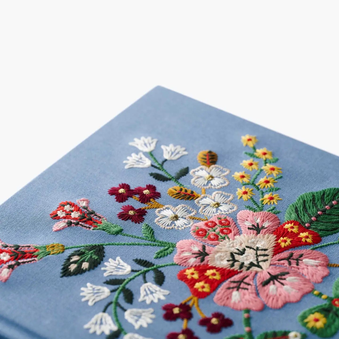 Our embroidered sketchbook is a large, hardcover journal with 108 unlined pages, perfect for sketching, drawing, and journaling. The cover is wrapped in blue book cloth and embroidered with our Gracie florals. Inside, an attached grosgrain ribbon bookmark will save your place.