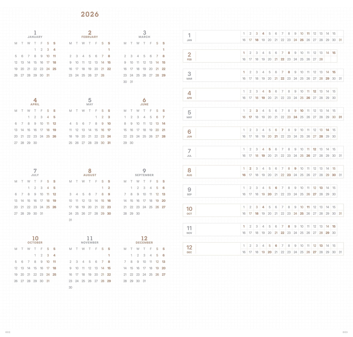 - Two spreads cover an entire month, keeping planning intuitive and straightforward.