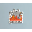 Bring a touch of humor and optimism to your belongings with our Funny Cats Vinyl Sticker. Measuring 3 x 2.75 inches, this sticker features a cool cat staying calm in the midst of flames with the caption 'optimist club.' Perfect for laptops, water bottles, notebooks, or any surface that could use a whimsical and motivational touch. Made from high-quality vinyl, this sticker is both durable and easy to apply