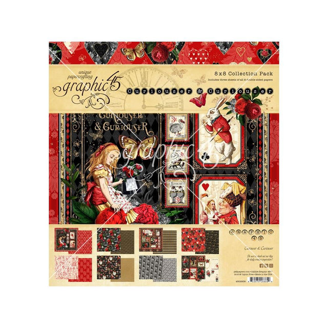 Introducing Graphic 45s enchanting Curiouser & Curiouser Paper Collection a whimsical journey into the world of fantasy and imagination. Inspired by classic tales of curiosity, this collection is filled with vibrant illustrations of iconic characters like Alice and the White Rabbit, alongside rich floral elements, vintage playing cards, and intricate butterflies. With bold reds, blacks, and golds, this collection is an ideal choice for creating romantic Valentines cards, heartfelt gifts, or even vintage-inspired home dcor. Whether your customers are seasoned crafters or just starting out, this collection will inspire countless Alice in Wonderland-themed creations. This package contains 8x8 collection pack.