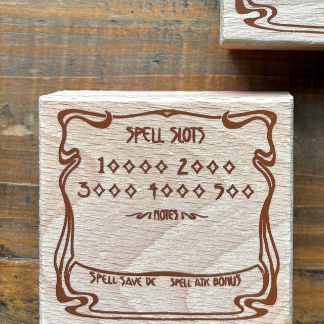 One rubber stamp to keep track of DnD spell slots! Each stamp is made with beech wood and measures roughly 2.75 x 2.5 x 1"
