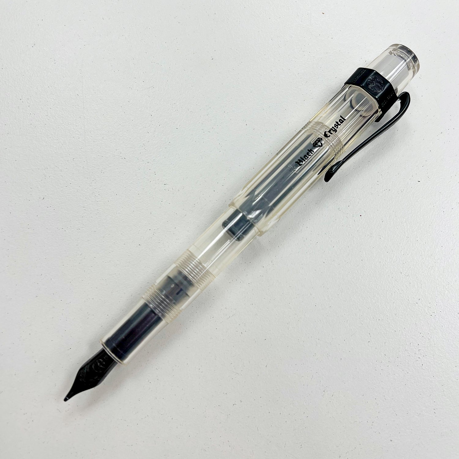A US exclusive Kaweco Sport featuring an transparent body, black nib, black trim, and a special "Black Crystal" logo engraved on the cap.