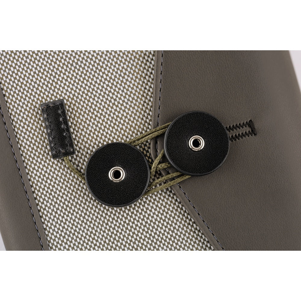 The round button and the ends of the string are made from genuine leather. The deep khaki string looks elegant whether wrapped simply or crossed stylishly as you wind it around.