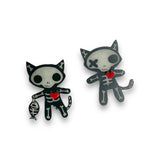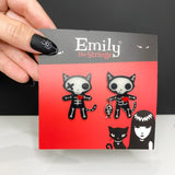 Si eres fanático de nuestros animales esqueléticos, te encantarán nuestros aretes de esqueleto de Emily® the Strange Fishin' Cat con licencia oficial. Estos gatitos tienen detalles que brillan en la oscuridad, un dije colgante de pez y tachuelas de acero quirúrgico.