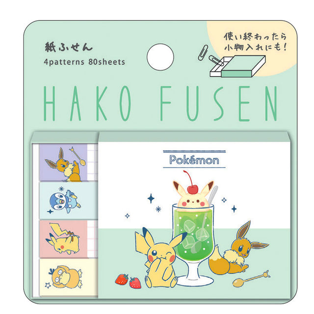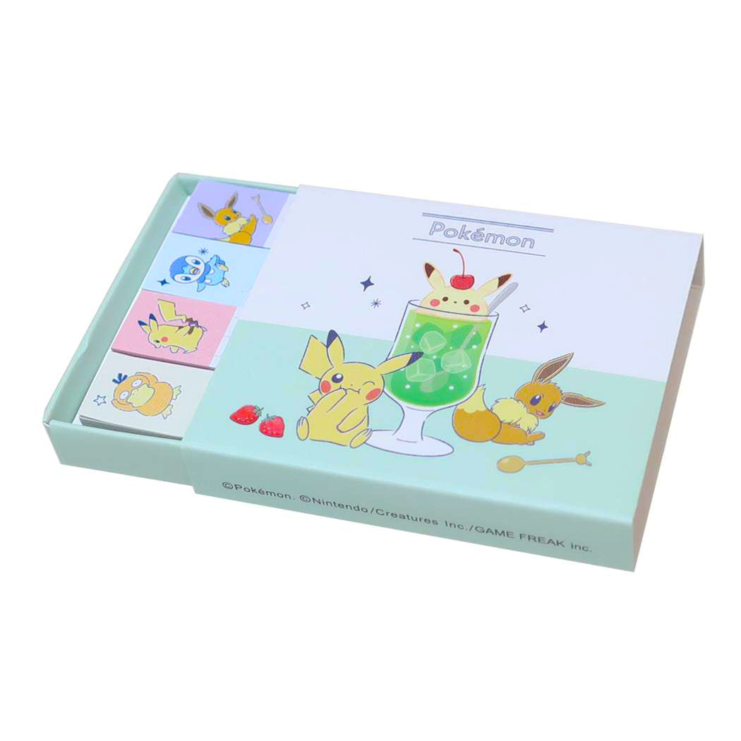 Notas adhesivas de Pokémon Snack and Tea en una linda caja, que se puede usar para guardar artículos pequeños cuando hayas terminado de usar las notas adhesivas.