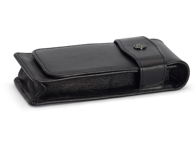 Minimalist and protective flap pouch for three pens in standard size made of black leather.
