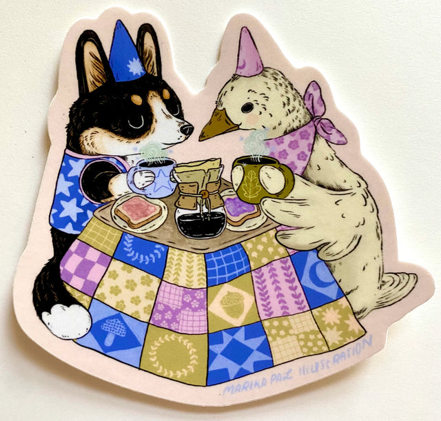 Two friends fill their cups up and spend some time together. This vinyl matte sticker is weather and waterproof-stick it on a notebook, bike, or car- it's going to stick around! Heck, throw it on a water bottle and through the dishwasher. This sticker can go anywhere.