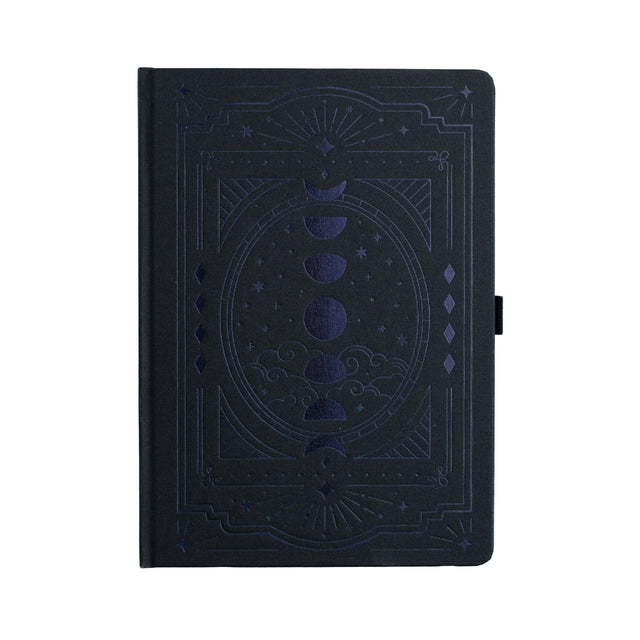 - Elegant black buckram cover with a subtle, embossed celestial design