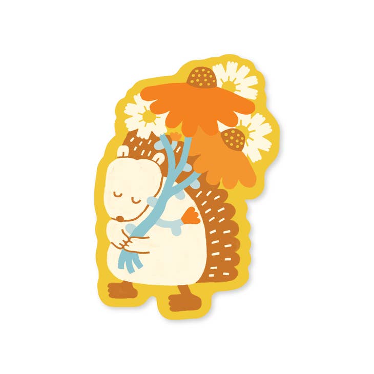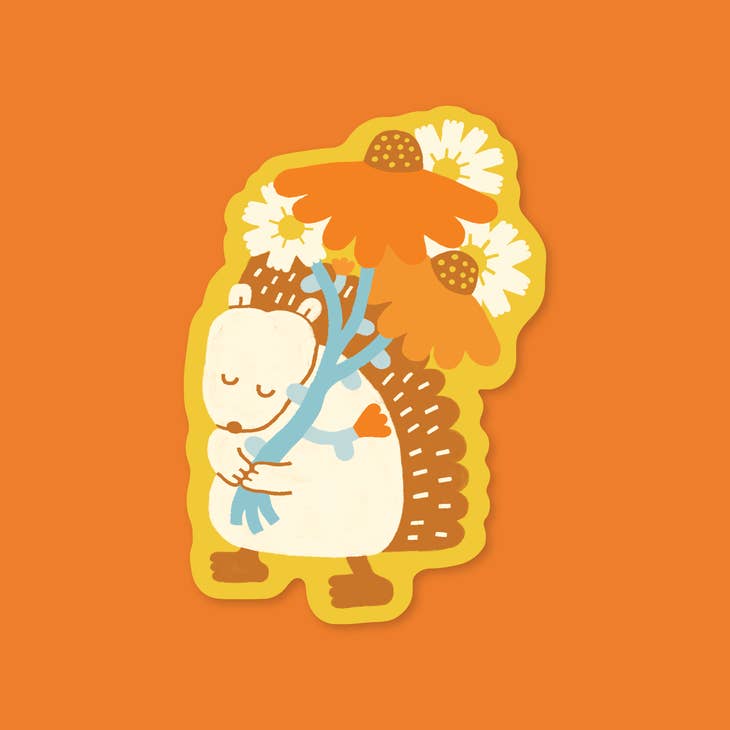 Un ramo alegre sostenido por un tierno erizo. Esta calcomanía de vinilo duradera es resistente al agua y a la intemperie, perfecta para decorar cosas como botellas de agua, autos y computadoras portátiles.