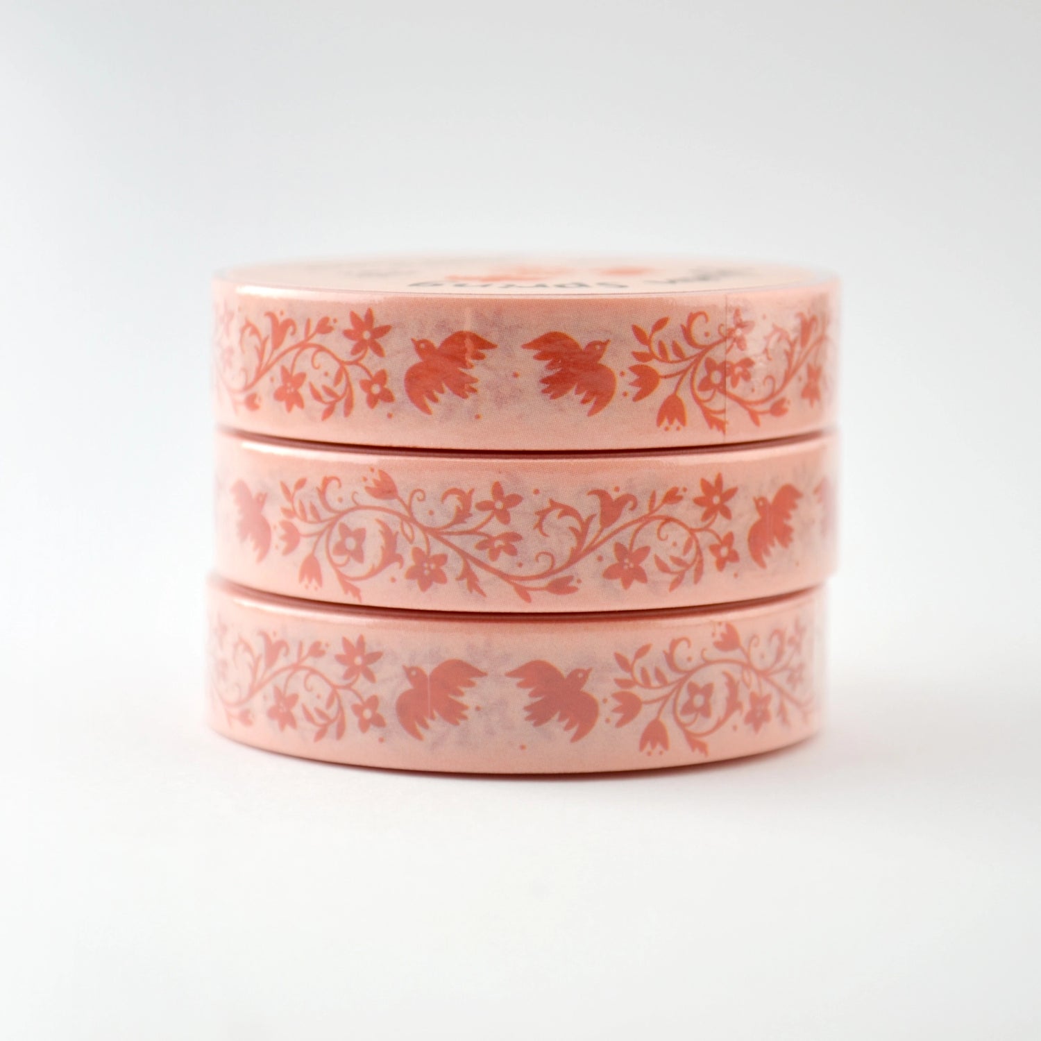 Last Chance! This narrow washi tape features a design of fanciful birds and flowering branches, inspired by the peaceful feeling of being in a shady wood in the springtime.
