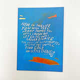 Aquí en esta vida sentirás muchas cosas. Reirás y te soltarás. Recopilarás historias. La luz te interrumpirá. Encontrarás oro en las pequeñas cosas.