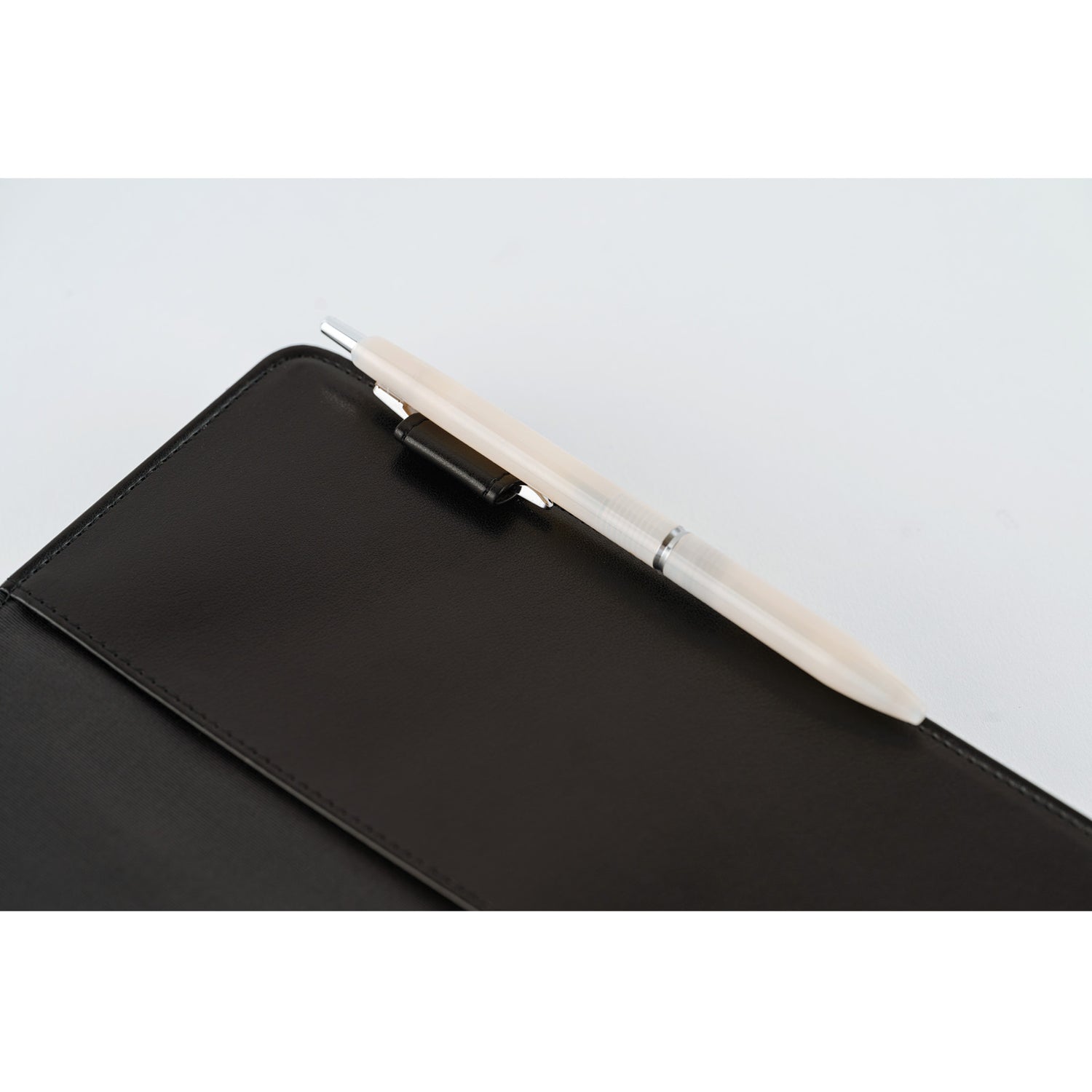 El gancho para bolígrafo puede sujetar un bolígrafo por su clip y la forma de la tapa permanece agradable cuando está cerrada.