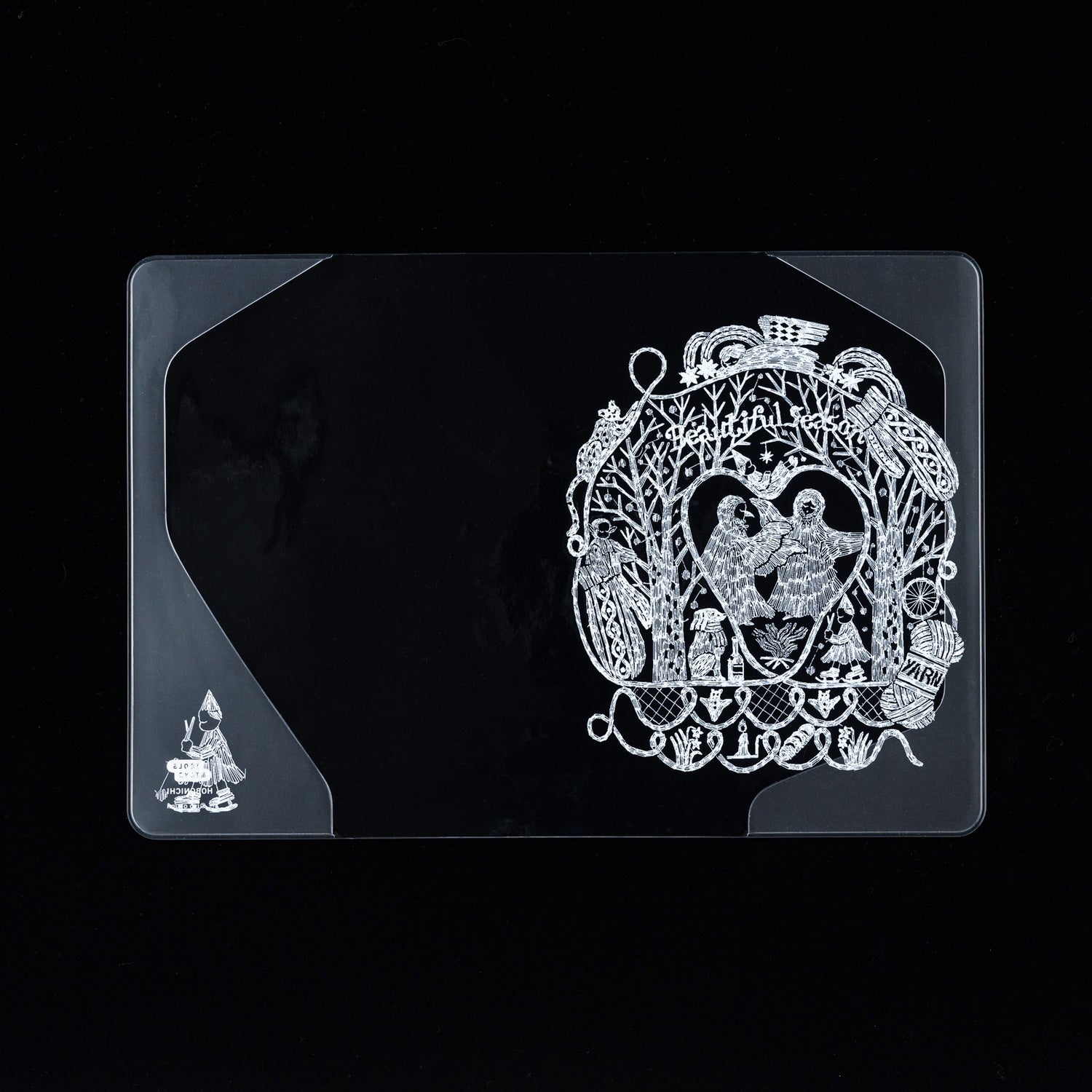 Nieve cayendo sobre los árboles, un suéter cálido y personas aladas bailando junto al fuego. El llamativo color blanco combinado con la delicadeza del bordado hace que la obra parezca cristales de nieve. La tranquila belleza de esta obra te encantará y te hará deleitarte cada vez que la mires.