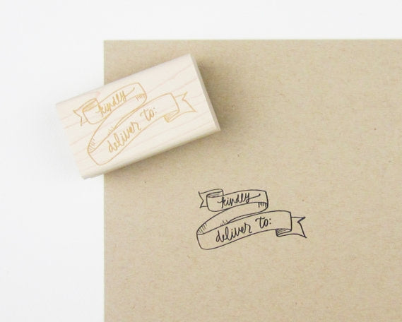 Este sello escrito a mano dice "Envíe amablemente a" dentro de un hermoso cartel dibujado a mano. Este sello mide 2" (51 mm) de ancho por un poco más de 1" (28 mm) de alto.