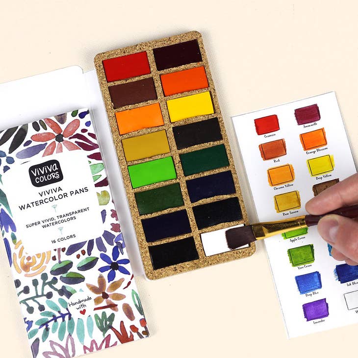 Las pastillas para acuarela Viviva están hechas a mano con destreza con una base de corcho natural y los pigmentos de mayor calidad para brindarle una sensación rica y orgánica a la pintura. Vienen con 16 colores vibrantes y duraderos que son RESISTENTES A LA LUZ.
