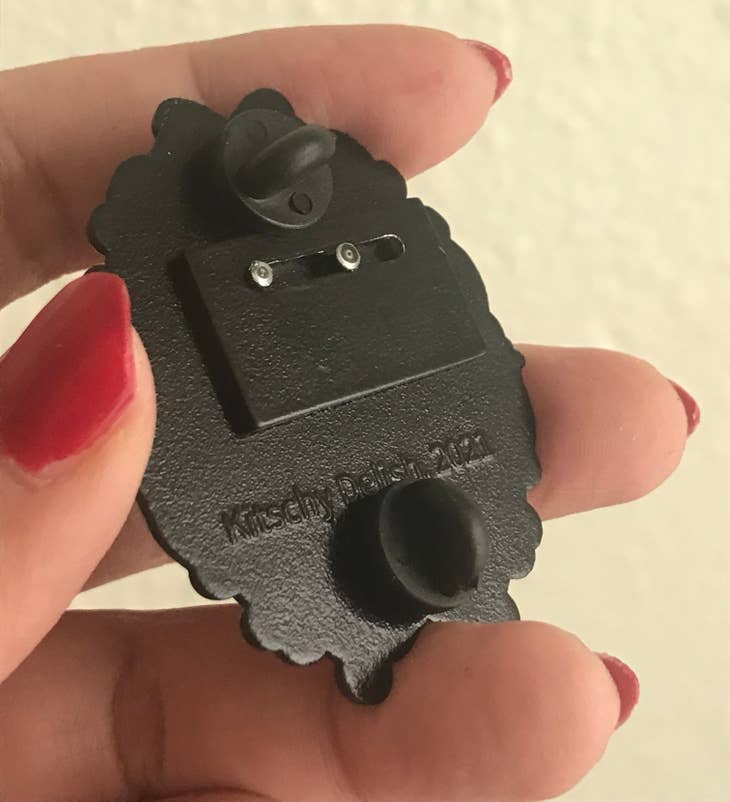 The pin measures 1.65" tall and has 2 rubber clutches on the back.