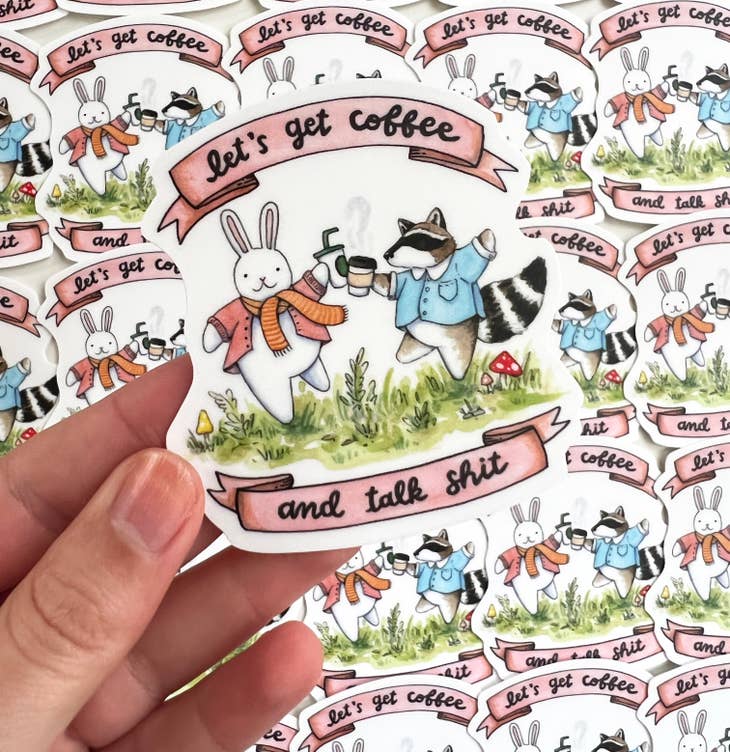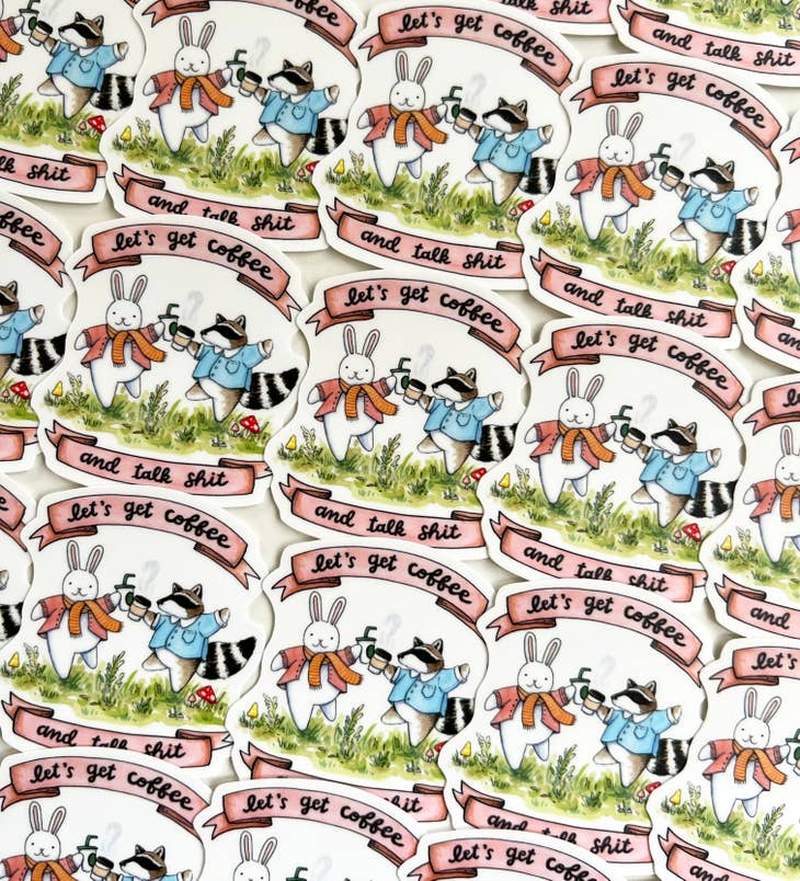 "Let's Get Coffee and Talk Shit" hand lettering above a watercolor illustration of adorable, frolicking, coffee-drinking friends! This sticker is die cut, durable vinyl and waterproof.