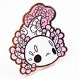 A cute axolotl enamel pin with floral decor! This amphibian pin badge is made with polished gold plating and hard enamel. It comes presented on a decorative trading card showcasing the species' name and some fun facts.