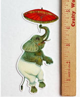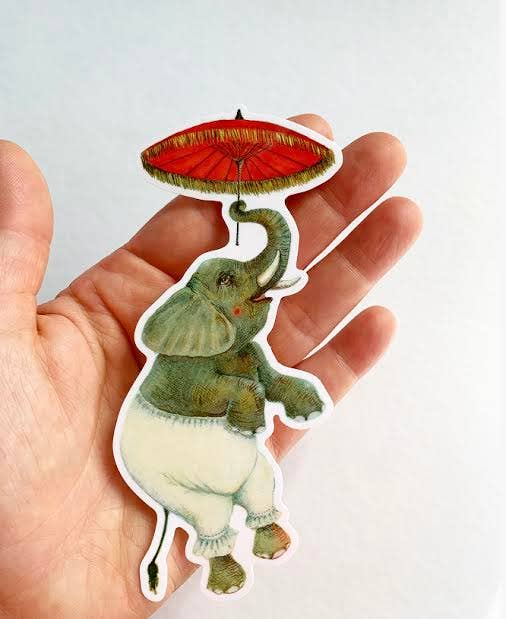 A vinyl sticker featuring the dancing elephant from artist's painting "Pantaloons and Parasols!