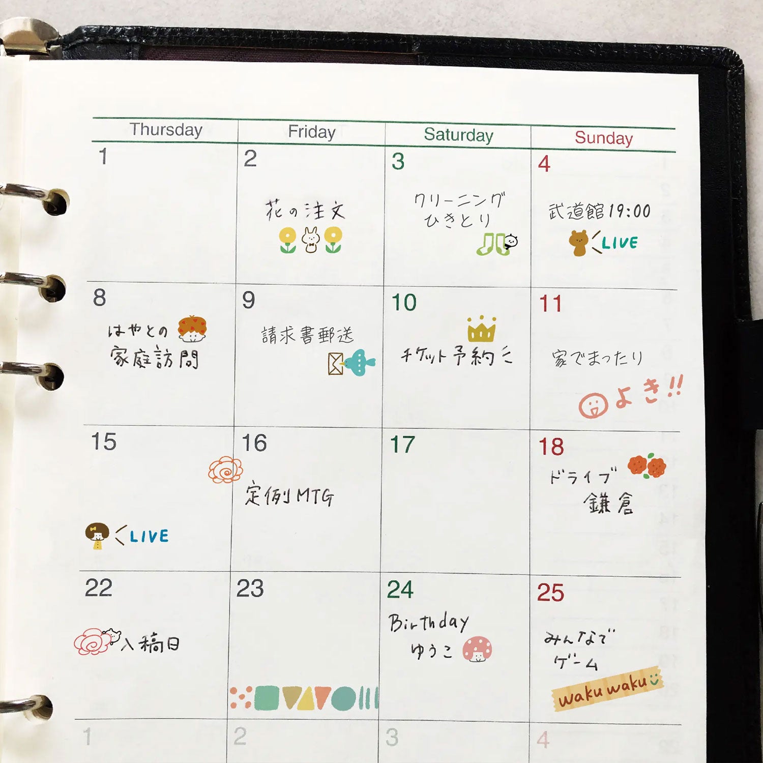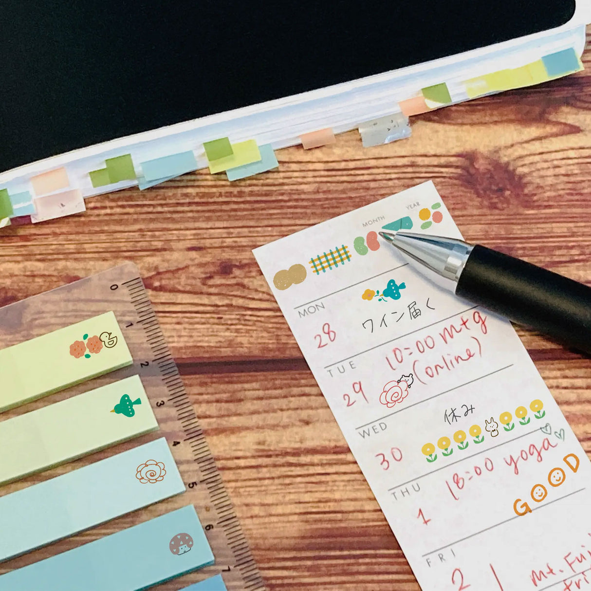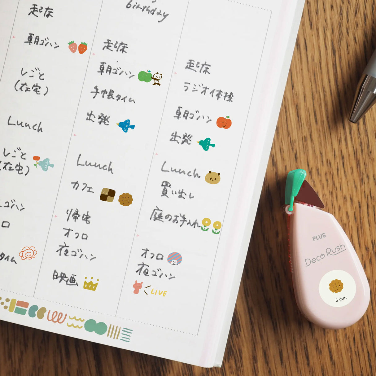Deco Rush is a decorative tape that works like a correction tape and provides an easy way to spruce up your pages with a cute look. You can use it to accent where you’ve written plans for the day or draw a line with it to make a section of the page stand out.