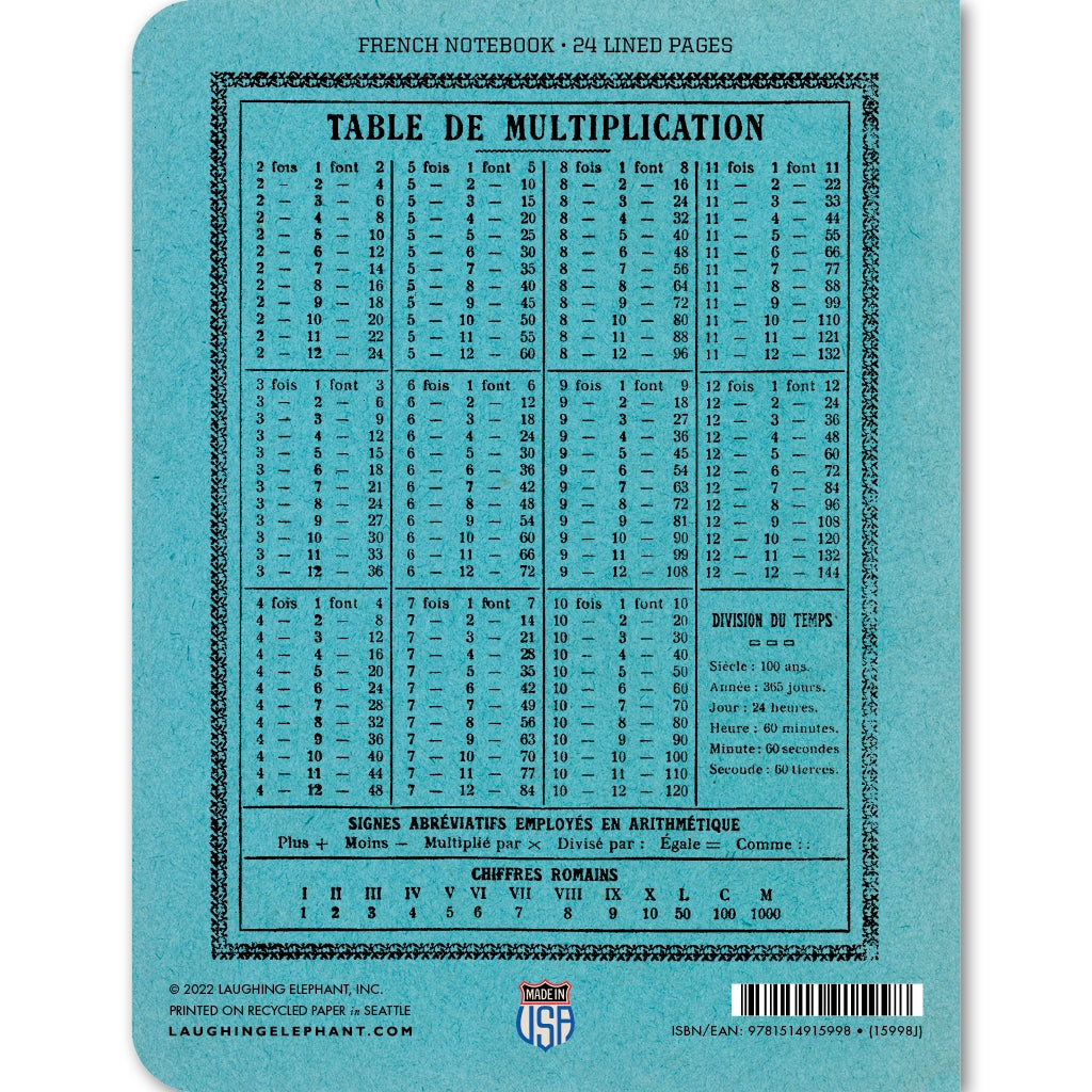 This is a dessin quadrillé, or grid drawing, notebook with exceptional design! It's unique among our journal notebooks, featuring gridded pages instead of the standard lines, ready to record your drawings or designs. The back cover features vintage-style information, such as multiplication and measurement tables.