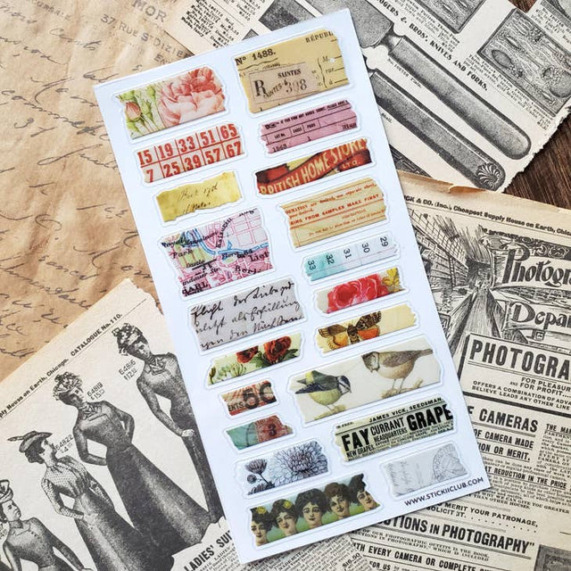 Some things truly last forever. This sheet of vintage ephemera strips features wallpaper pieces and train tickets that allow you to keep a piece of the past with you always.