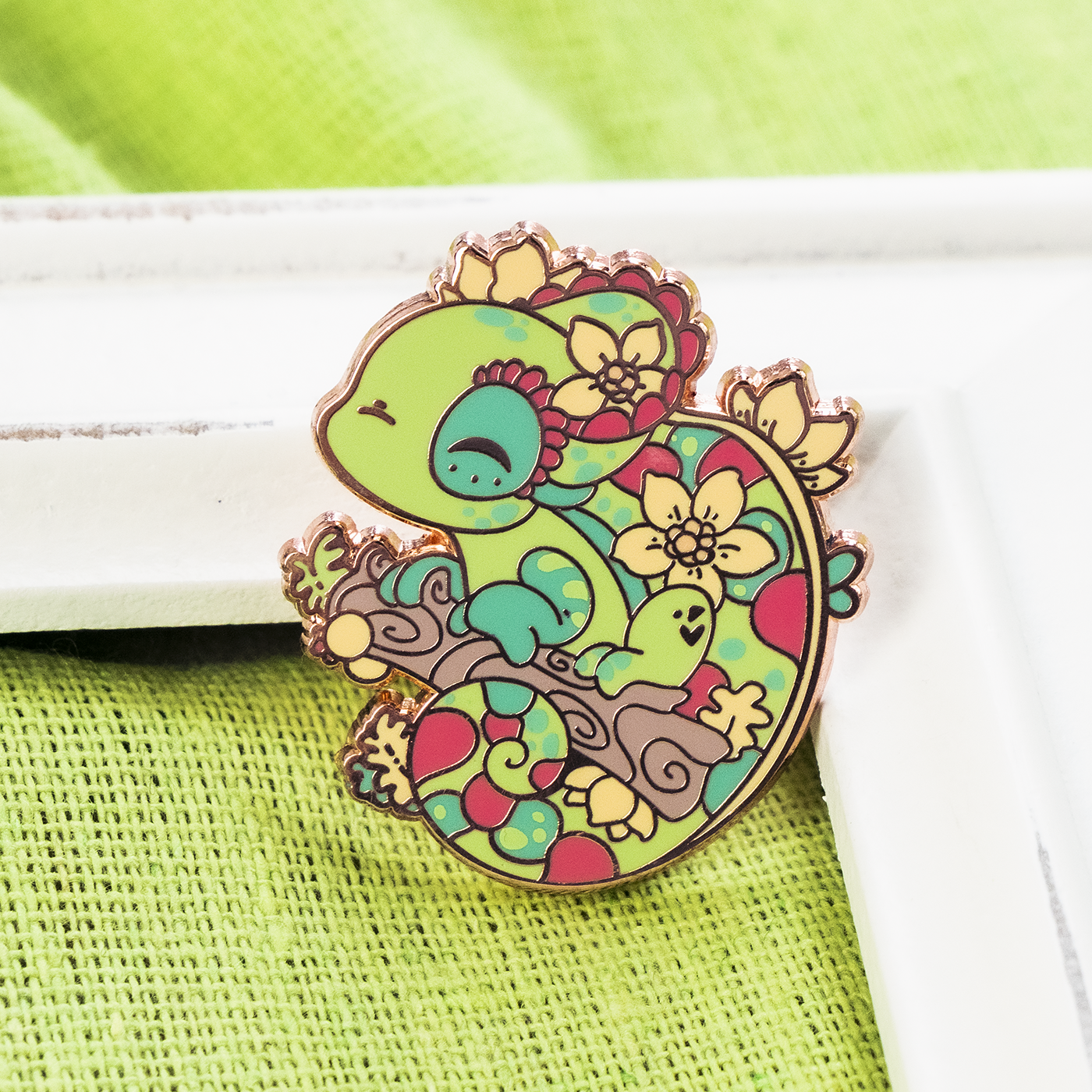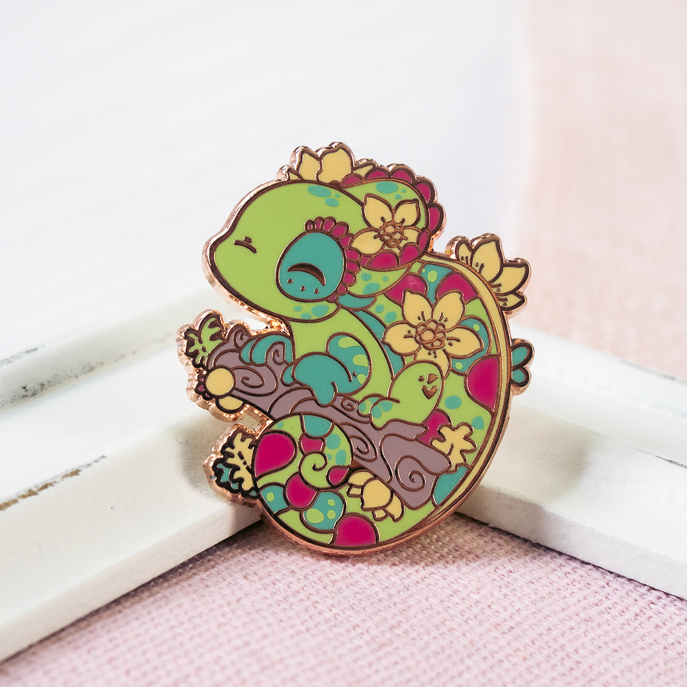 A kawaii enamel pin featuring a happy Jewelled Chameleon! Also known as the Madagascar Forest Chameleon, this sweet critter is endemic to the central highlands of Madagascar. It can grow to a total of 14cm in length. The Jewelled Chameleon has been paired up with a yellow variant of the Madagascar Hibiscus flower.