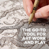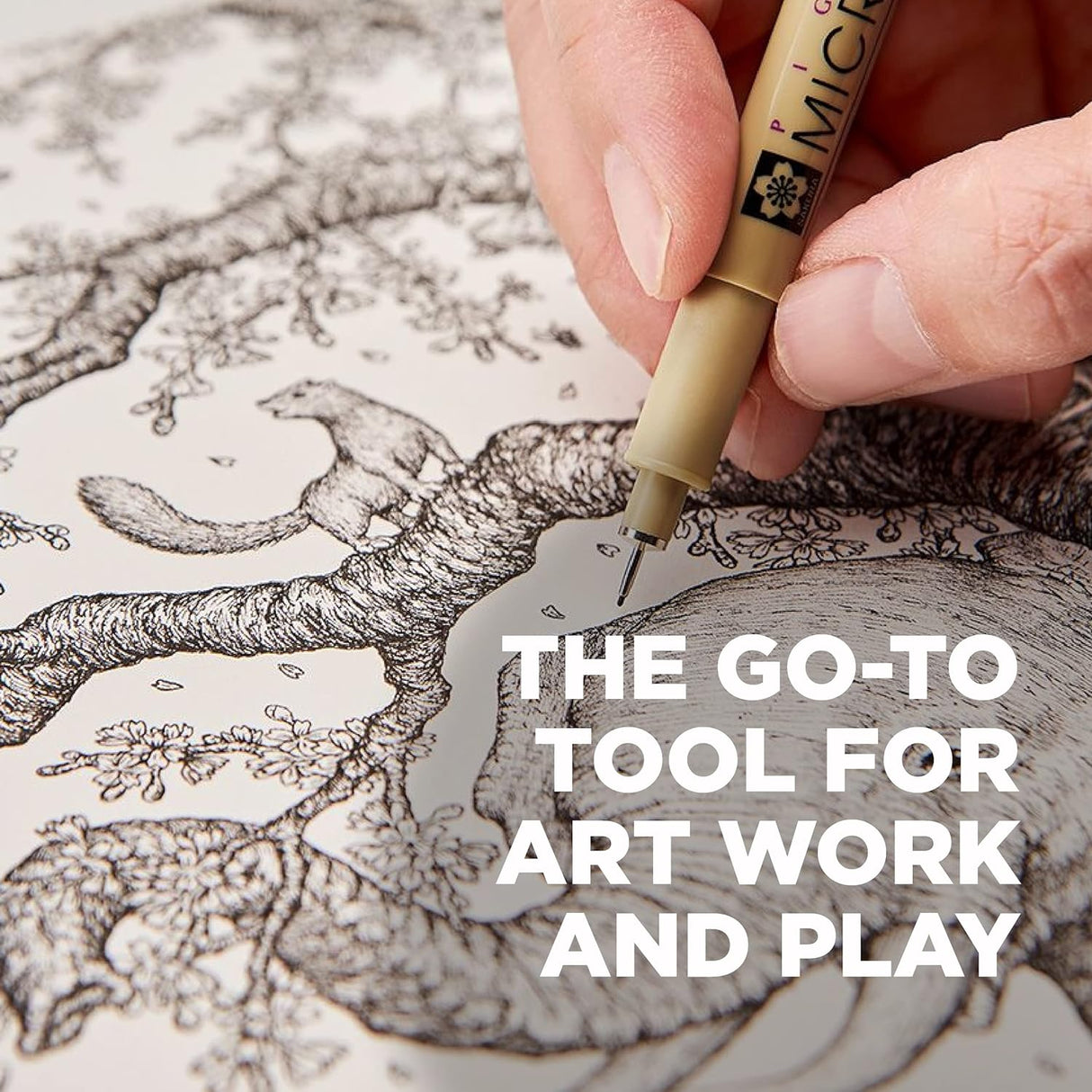 Pens with a waterproof, quick-drying pigment ink that will not feather or bleed through even the thinnest papers. Inks are smear proof once dry and fadeproof against sunlight or UV light. Colors remain vibrant and are permanent and washable on cotton fabrics.