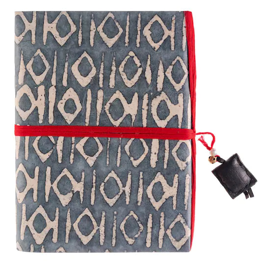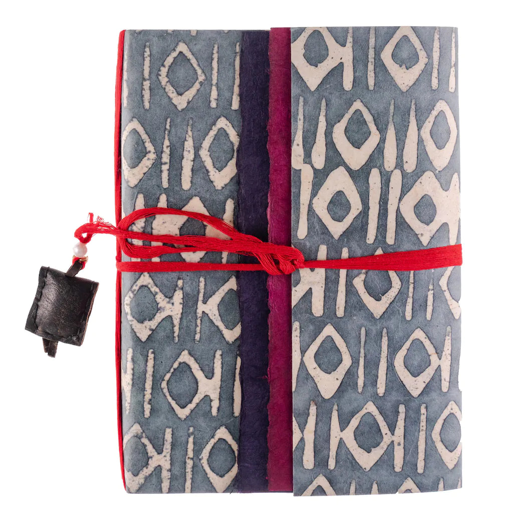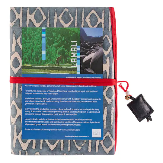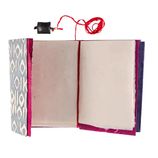 These multi-purpose journals are ideal for writing, drawing, sketching and multi-media. Journals measure 6" x 8" and include 64 pages of natural Lokta paper, 64 pages each of cream, white and recycled parchment paper, 16 pages of black Lokta paper and 4 pages of colored Lokta paper. Their flexible soft-cover is made with screen printed or Batik patterned Lokta paper, with a fold-over flap and tie closure. Journals are sewn-bound. Manufactured by hand in the Kathmandu Valley of Nepal by a certified fair trade workshop. As products are handmade, small variations in color and thickness can occur.