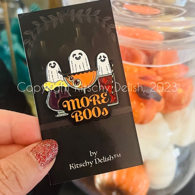 More BOOs soft enamel pin! Based on an original illustration by Kitschy Delish, this pin is a fun play on words just in time for Halloween! It measures approximately 1.5 inches wide. Hard recessed metal.