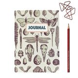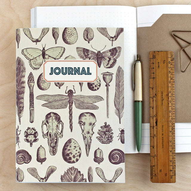 Journal with a Natural history design. Book contains an assortment of lined, plain, dot, craft and framed papers as well as glassine pockets and manila envelopes.
