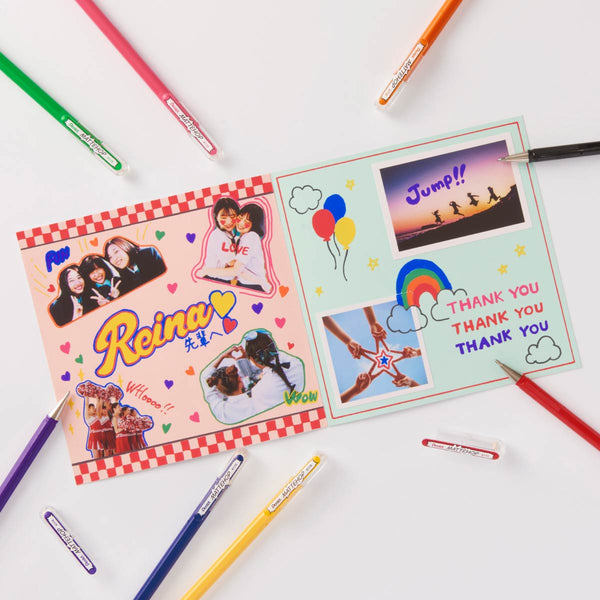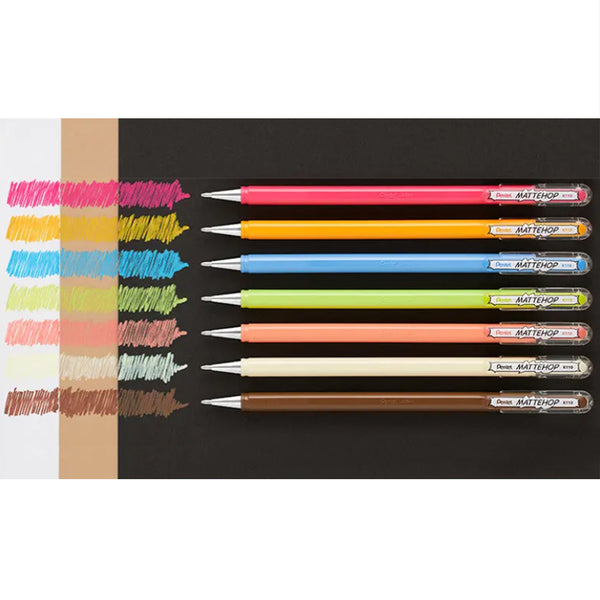The Pentel MATTEHOP Gel Pens feature extremely pigmented, high-opacity ink that dries with a matte finish, creating a highly visible, paint-like effect look. Mattehop pens can be used on white or colored paper like black and kraft papers. The ink remains opaque on dark surfaces. They're also a great choice for writing on photos, coated papers and washi tape, making them ideal for decoration. Their vibrant colors are perfect for comics and illustrations to make them pop.