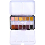 This 3x5x1 inch package contains 12 watercolor pans within one metal palette tin with two fold-out mixing areas.