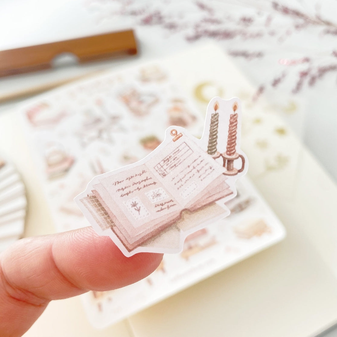A beautifully detailed book sticker sheet for readers that love to read at home! Put your favorite reading items into your bullet journal or planner with this sticker sheet. The sticker sheet contains lovely aesthetic books, plants, beautiful tables, coffee and tea, candles, and an amazing bookshelf.