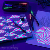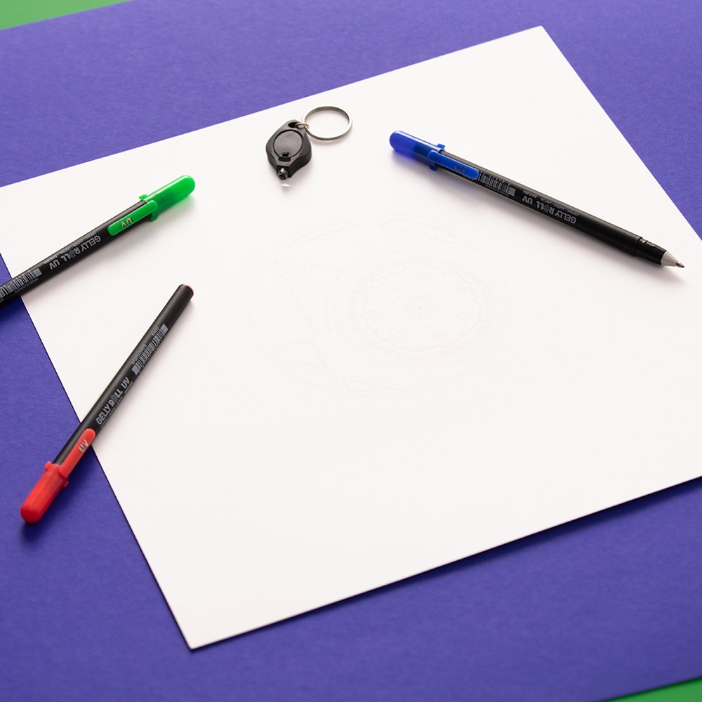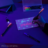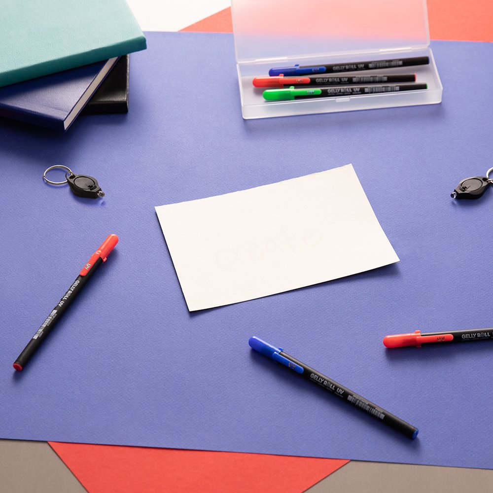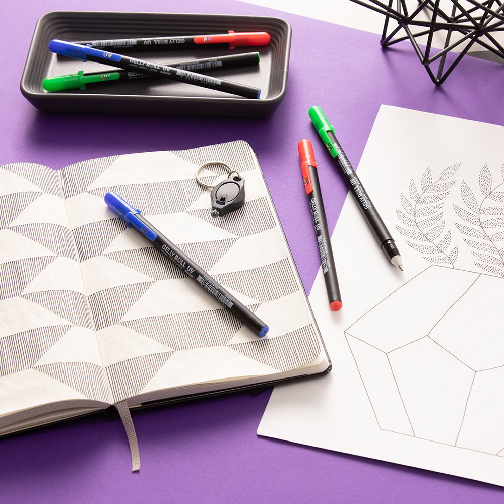 Unlock the magic of Gelly Roll UV, the first UV-visible gel ink pen. Our UV ink dries clear and can be seen only under UV light, where the ink glows beautifully in 3 luminous colors: Red, Blue, and Green.