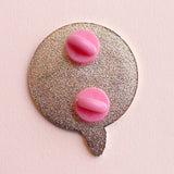 This gold hard enamel pin is secured with two pink rubber clasps, carefully packed on a cute pink backing card.
